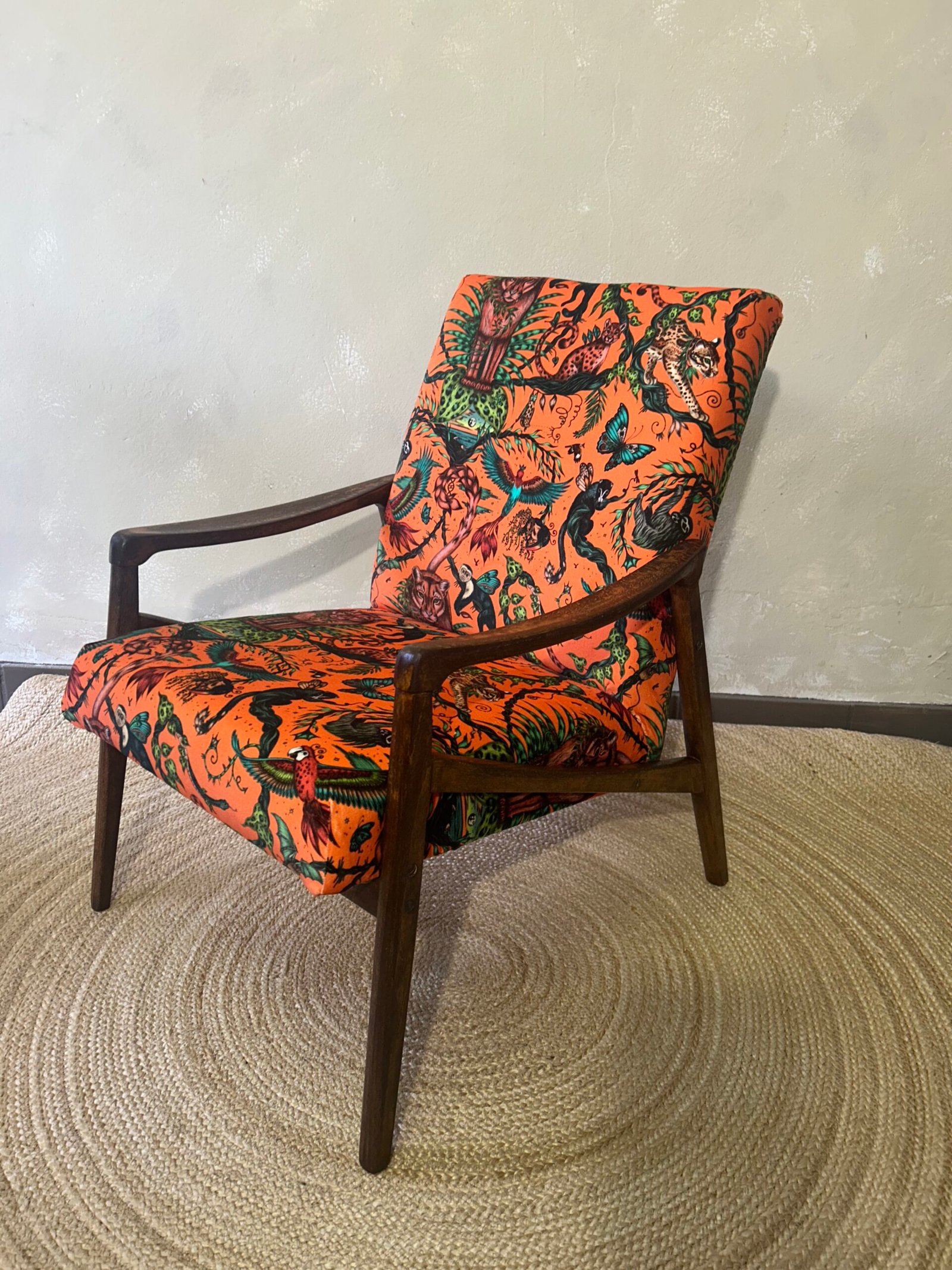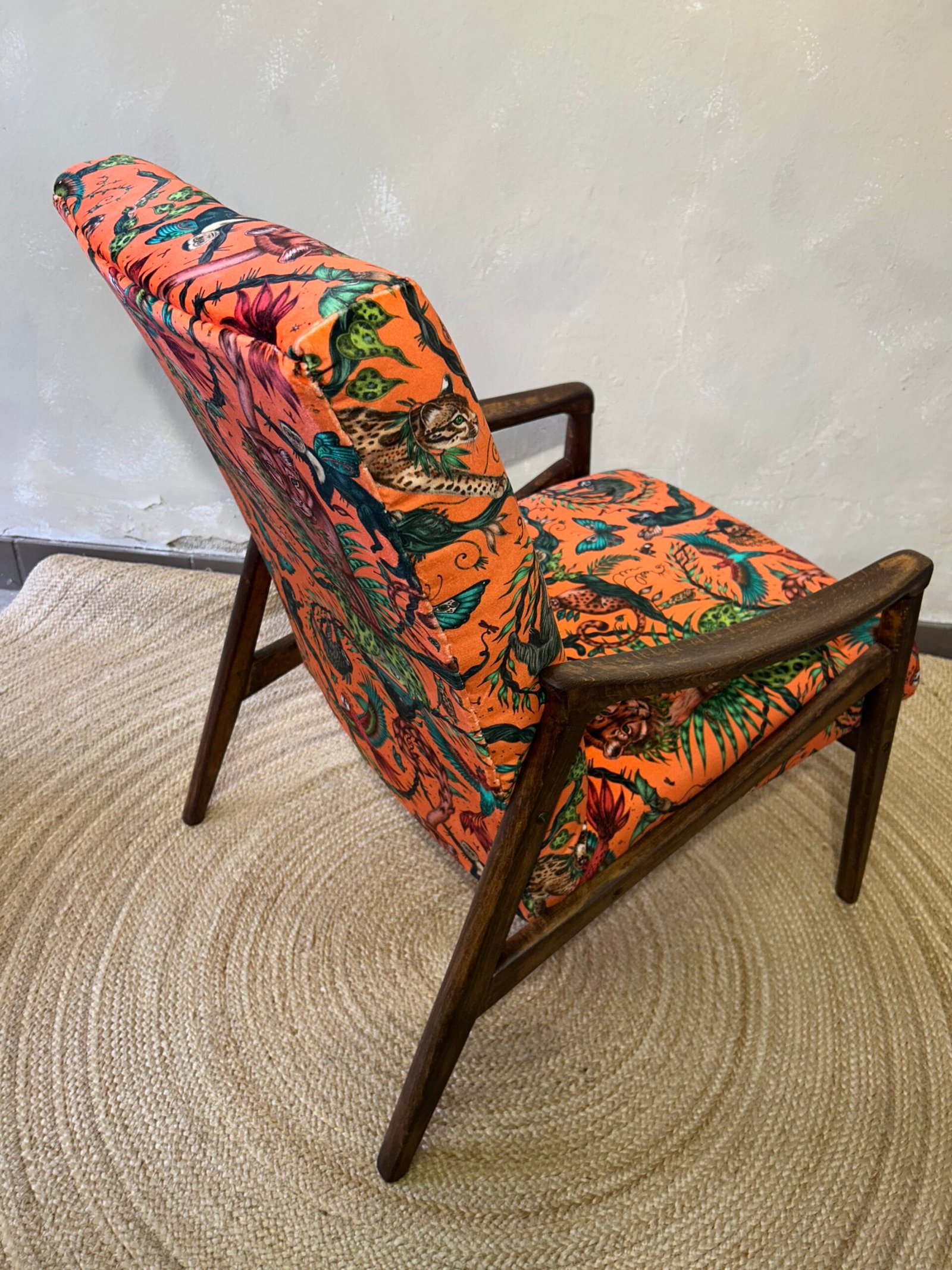 Křesílko ze 70. Let v luxusním oranžovém sametu, subtilnější ( menší) než Céčko