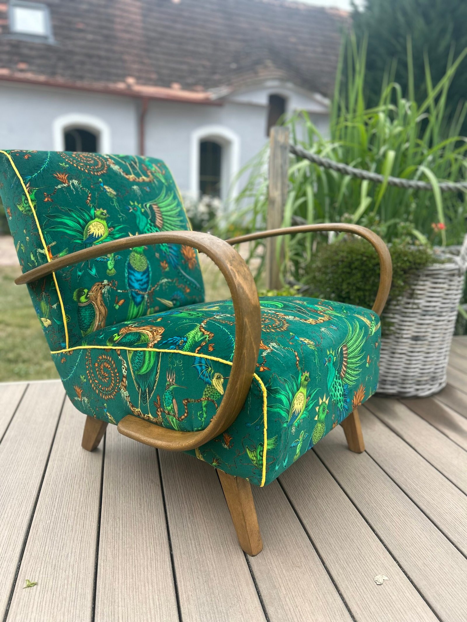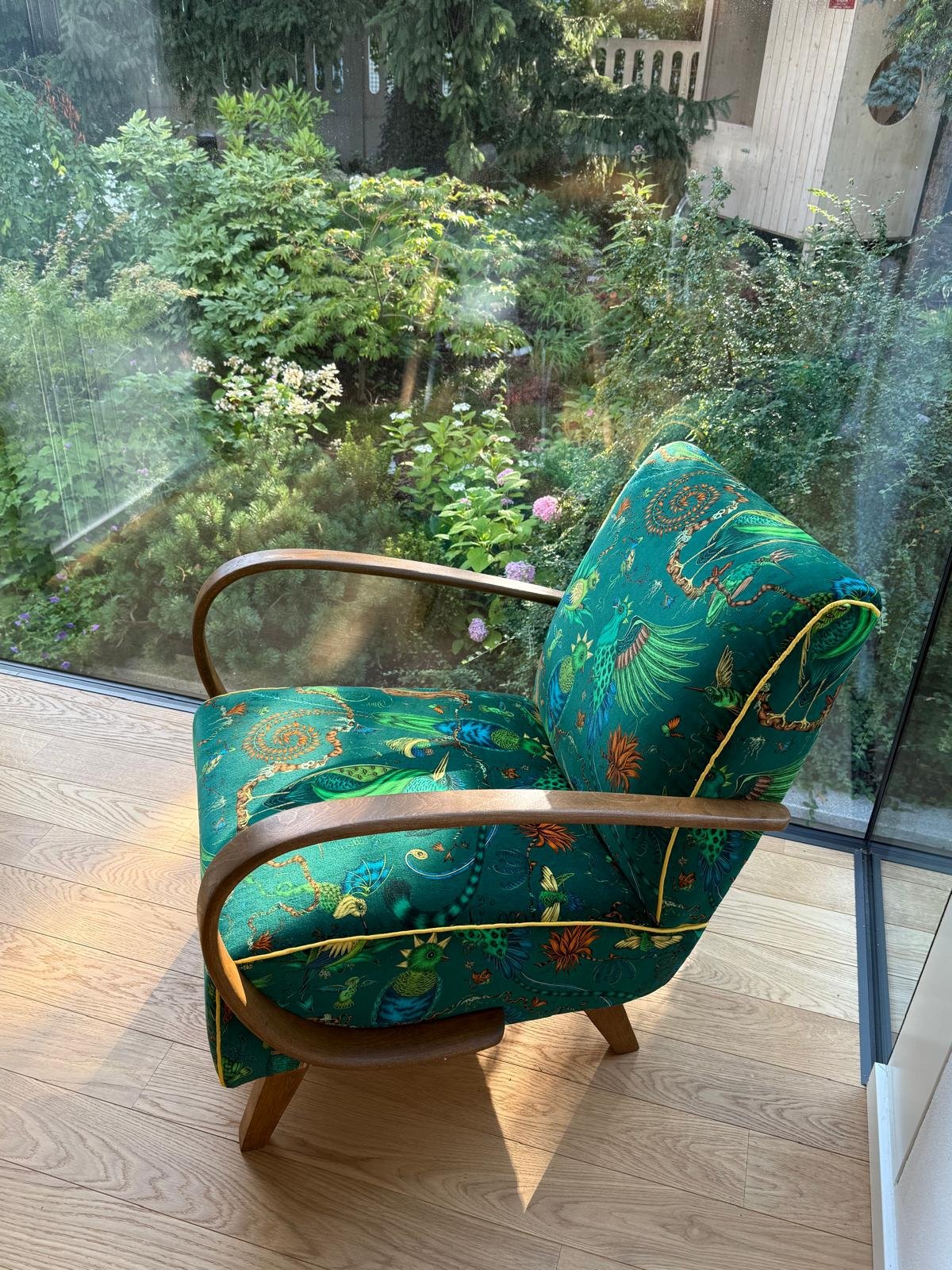 Nadherný kousek ve smaragdove zelené látce s ptáčky a výraznou žlutou paspulí. To že jde o samet jen zvedá majestátnost křesla. Dřevo namořeno a ošetřeno osmo oleji.